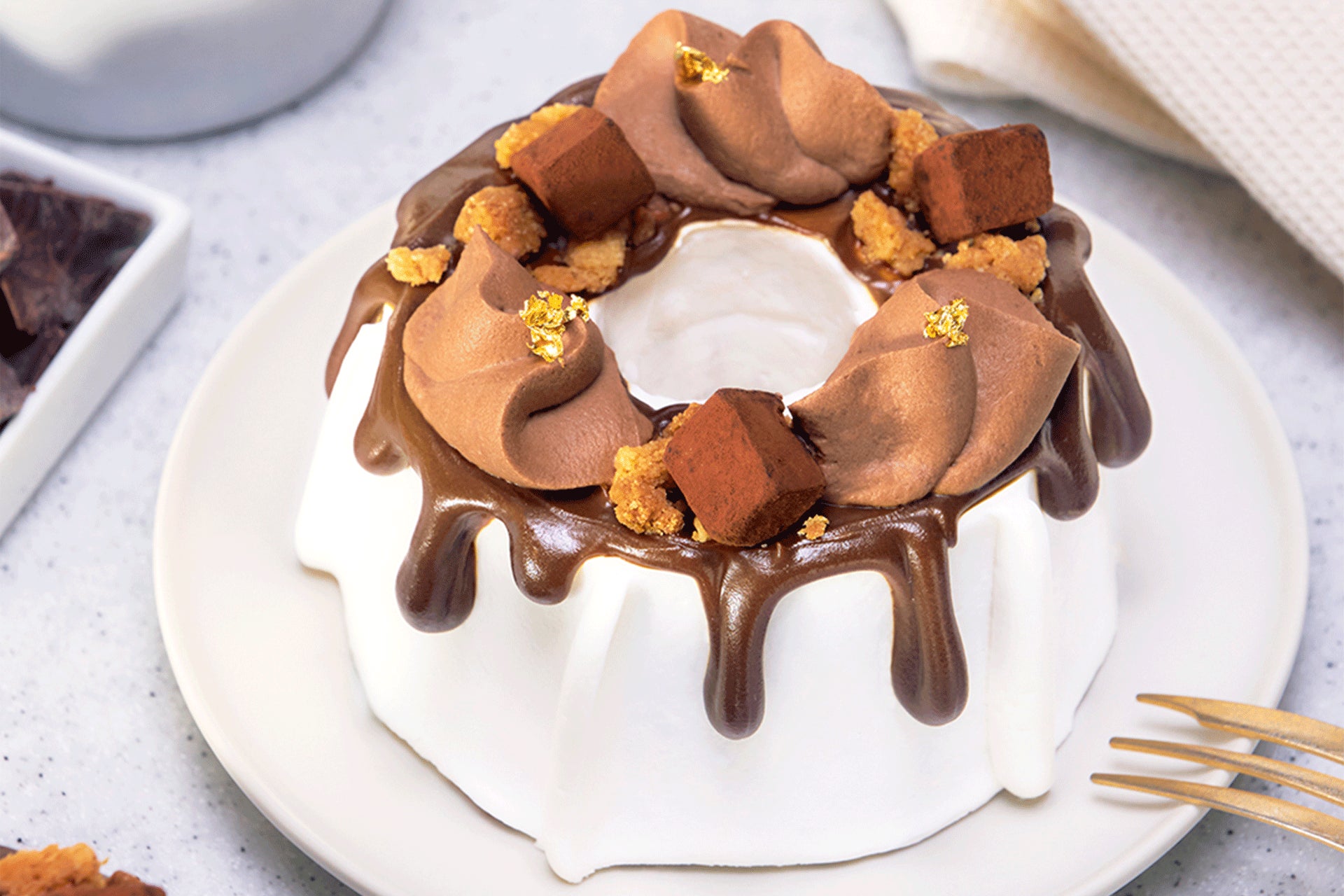 トップにはオリジナルブレンドのチョコレートクリームをトッピングし、さらにクランブルや生チョコを合わせて、チョコレート好きにはたまらない、高級感溢れるシフォンケーキに仕上げました。