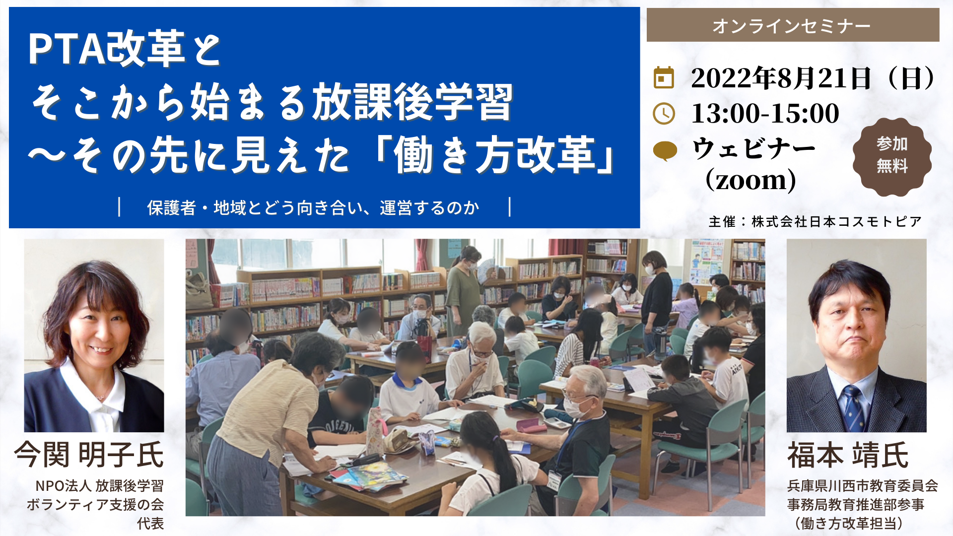 「自立学習」「生涯学習」を事業の軸とし、学習塾・学校・生涯学習教室向けICT教材システムの企画・制作・販売を手がける株式会社日本コスモトピア(本社:大阪府大阪市、代表取締役社長:下向 峰子、以下:日本コスモトピア)は、学校関係者、保護者を対象とした無料オンラインセミナー「PTA改革とそこから始まる放課後学習〜その先に見えた『働き方改革』〜」を、8月21日(日)13:00-15:00に実施します。