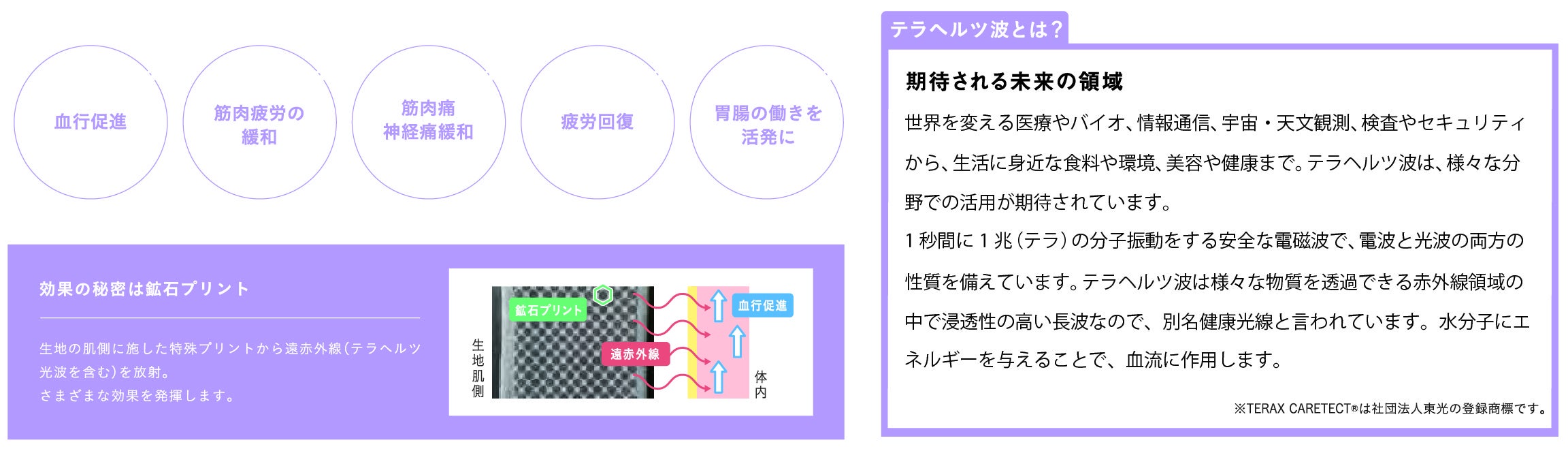 遠赤外線(テラヘルツ光波を含む)を放出する鉱石をプリントした進化系素材、テラックス ケアテクトを採用しました。