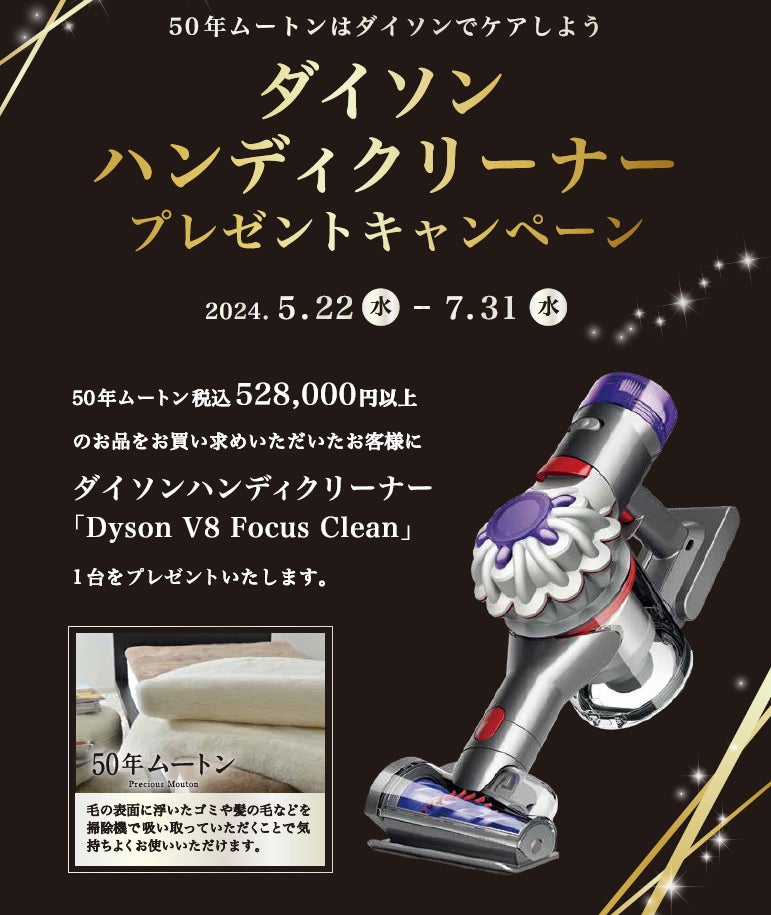 ・内容:対象商品ご購入に対してダイソンハンディクリーナー「Dyson V8 Focus Clean」1台プレゼント