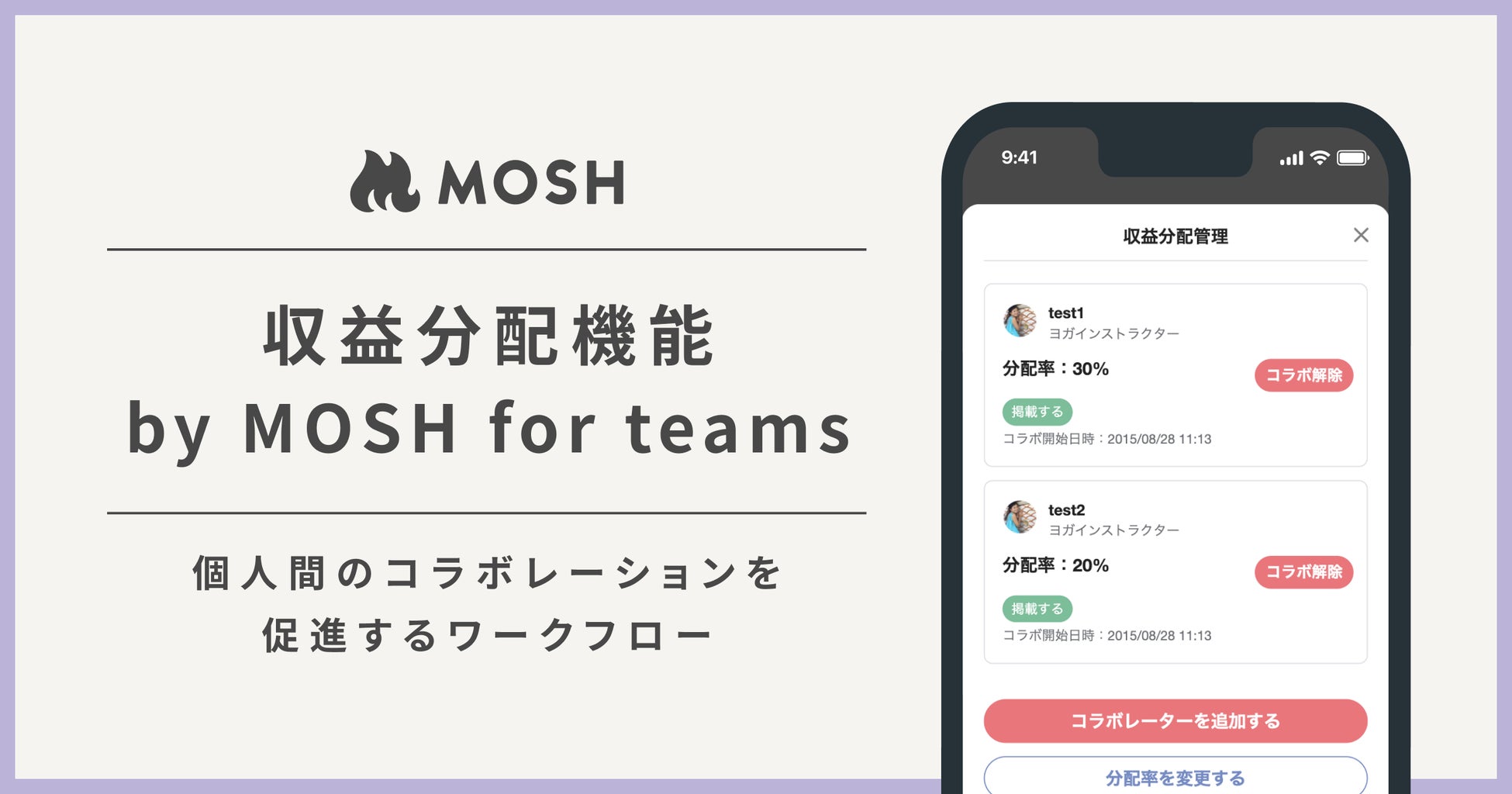「MOSH for Teams」は、複数の個人クリエイターでサービスを共同開催し、任意で設定できる分配率に応じて収益を分配できるコラボレーション機能です。
