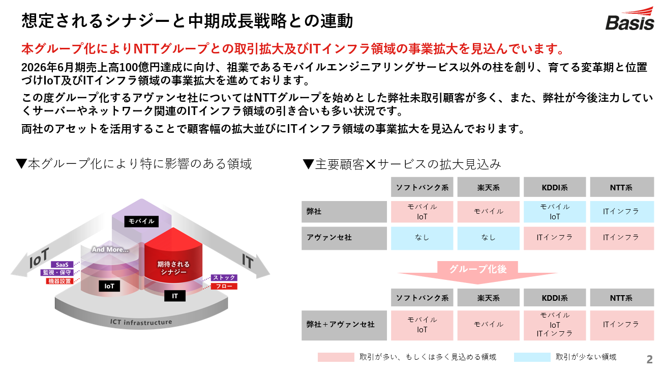 本グループ化によりNTTグループ、KDDIとの取引拡大及びITインフラ領域の事業拡大を見込んでいます。