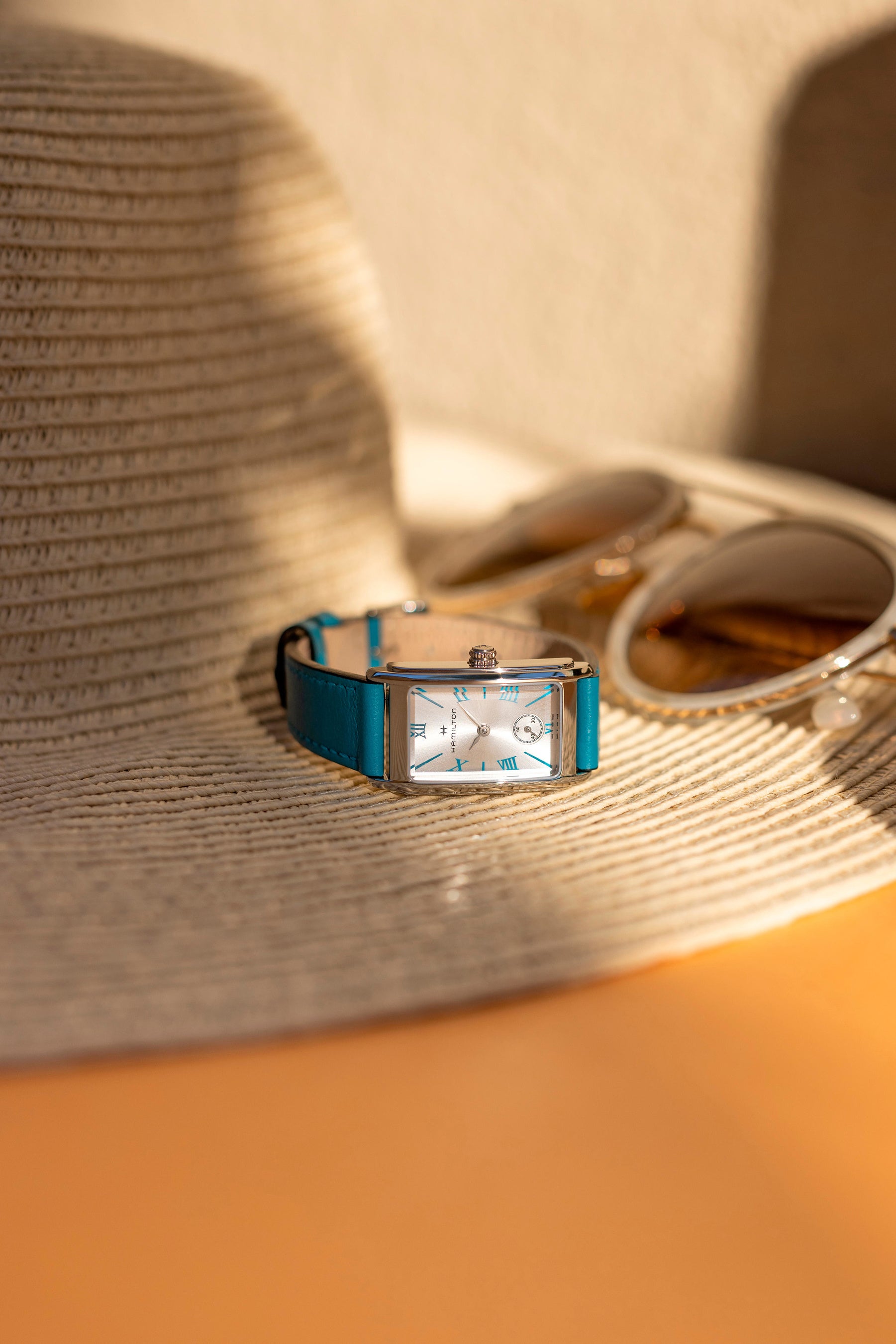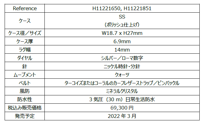 クールなターコイズまたは明るいコーラルのレザーストラップが付けられ、ストラップと同色のローマ数字が、レクタングルシェイプの「アードモア」シルバーダイヤルから浮き上がります。伝統を纏うものと新しいものがしっくり溶け合ったルックスが実現しました。