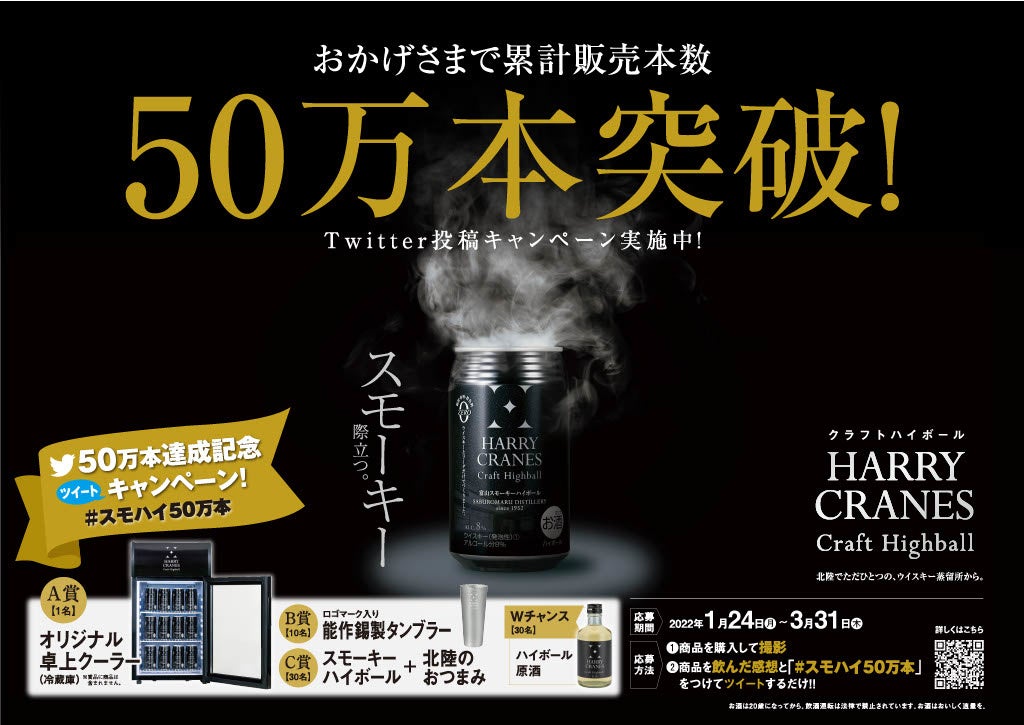 若鶴酒造株式会社(本社:富山県砺波市三郎丸、代表取締役社長:小杉康夫)が2019年3月25日に発売した自社のウイスキーを使用した本格的なハイボール缶「HARRY CRANES Craft Highball(ハリークレインズ クラフトハイボール)富山スモーキーハイボール」は、累計販売本数が2021年12月に50万本※を突破しました。