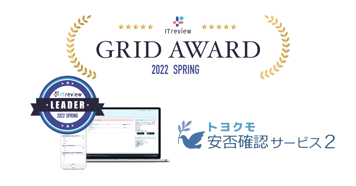 トヨクモ株式会社(本社:東京都品川区、代表取締役社長:山本 裕次、以下トヨクモ)が提供する災害時の安否確認システム「安否確認サービス2」が、「ITreview Grid Award 2022 Spring」の安否確認部門にて、最高評価の「Leader」を受賞したことをお知らせいたします。