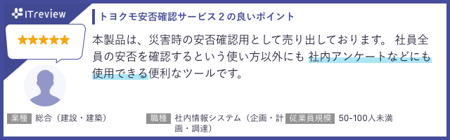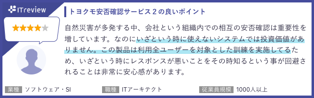 ITreviewとしても数多くのIT製品の中から、トヨクモ安否確認サービス2のような顧客評価の高い製品を国内のビジネスユーザーにご紹介できること、大変嬉しく思います。