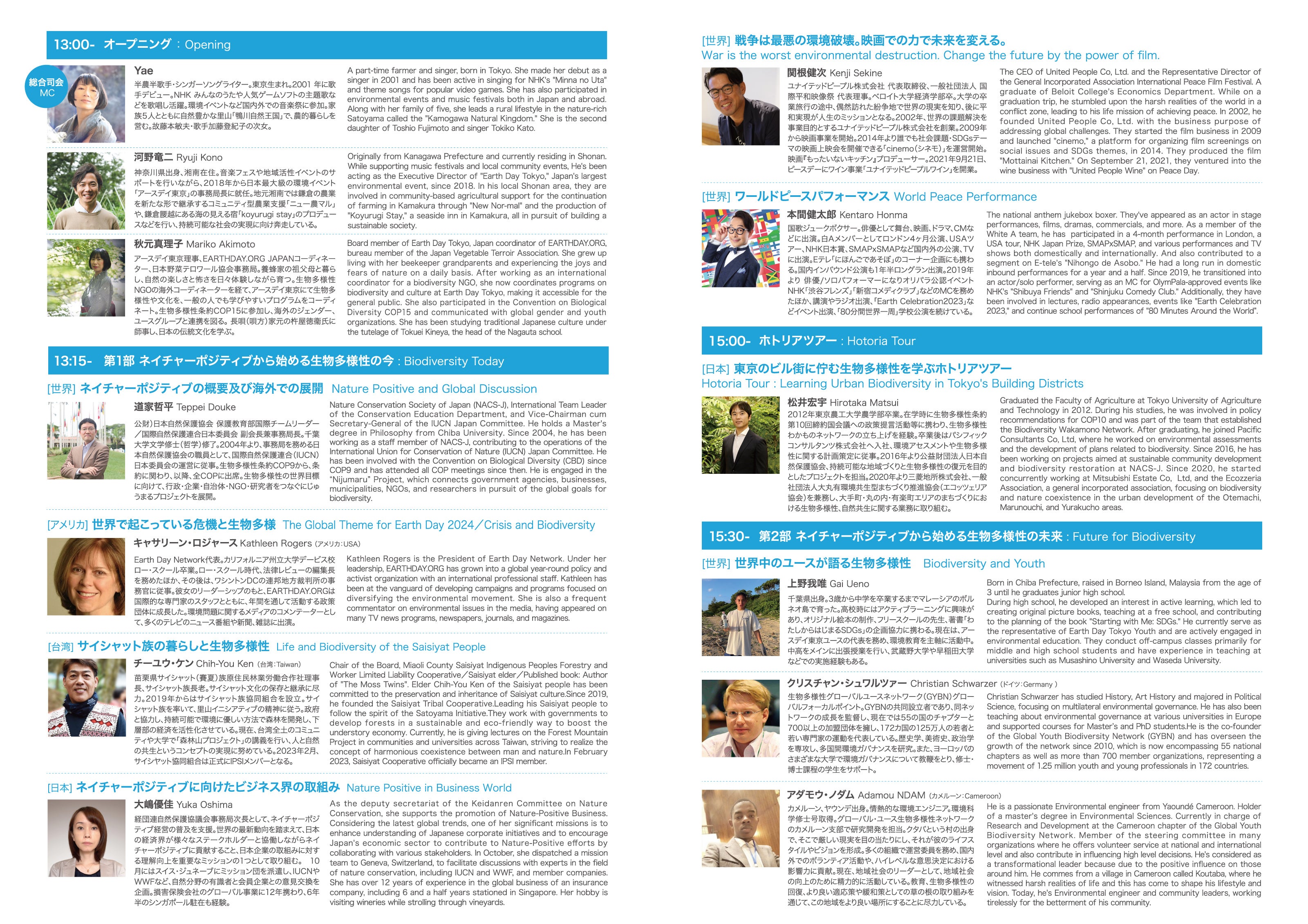 国内外から、NGO、ビジネス、先住民、ユース、アカデミック、エンタメと様々なセクターの方々に登壇いただき、横断的な交流から生みだされるシナジーにより、生物多様性の損失を止めながら回復させていくためのアースデイネイチャーポジティブアクションを、参加者の皆さまと創出して参ります。
