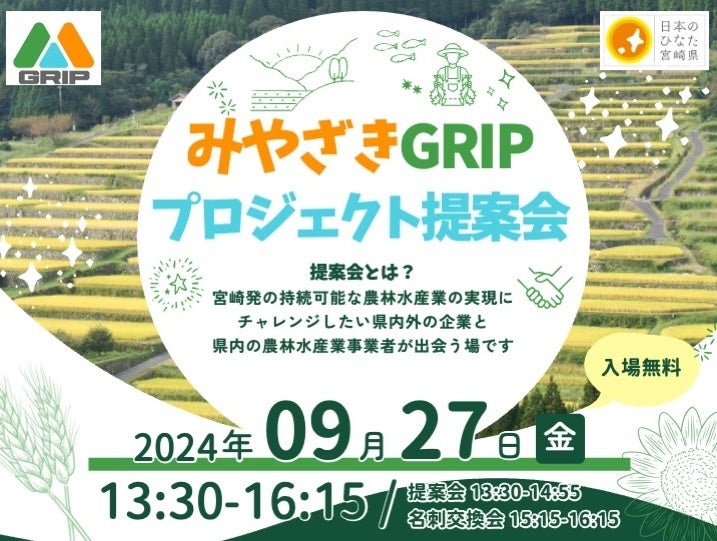 この度、宮崎県発の持続可能な農林水産業の創出を目指したプロジェクトチーム構築のため、みやざきGRIP会員の取組紹介や、マッチングを図るイベントとして、みやざきGRIPのプロジェクト提案会を開催いたします。