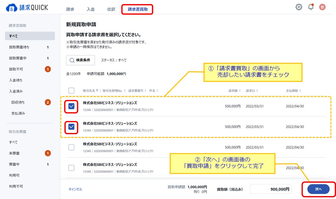 - 「請求QUICK」上からかんたん2ステップで請求書の買取申請が可能に