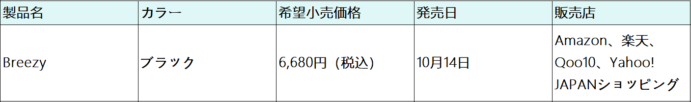 本製品の発売を記念し、10月14日(月)からBreezyの25%OFF特別セールを実施しま す。さらに10月17日(木)から20日(日)までの4日間は、Amazonにて弊社製品の特別セールを実施します。最大32%オフ、Breezyも最大25%オフという大変お求めやすい価格で提供いたしますので、ぜひご利用ください。