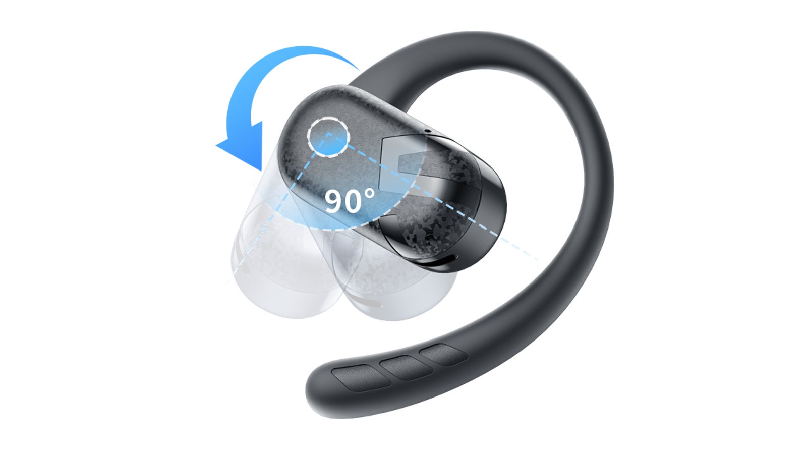 耳に掛けるタイプのオープンイヤー型完全ワイヤレスイヤホンは、構造上正確に耳穴へ向け音を射出することが難しく、音量不足や音漏れという課題を抱えていました。Breezyでは、ドライバーユニットを無段階に90°回転する機構を新たに開発、音が出るノズル部を正確に耳穴へ向けることが可能になり、従来のオープンイヤー型完全ワイヤレスイヤホンでは成し得なかった豊かな音量と音漏れ軽減を実現しています。