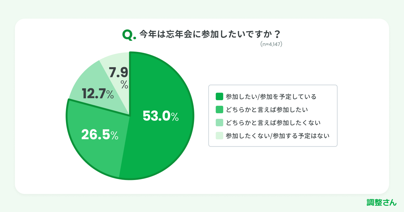 調査では、今年忘年会に参加したいか聞いたところ「参加したい/参加を予定している」が53%で最多となり、過半数を占めました。2位は「どちらかと言えば参加したい」で26.5%となり、今年忘年会に参加したいと考えている人は全体の79.5%であることがわかりました。