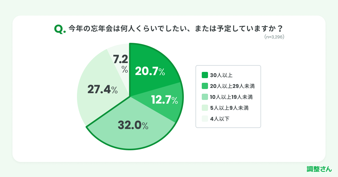 調整さんユーザーアンケート 今年忘年会に参加したい人の約7割「10人以上」で検討