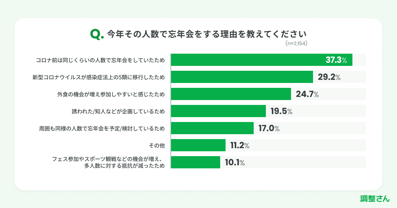調査では、今年の忘年会を10人以上でしたい人を対象に「その人数で忘年会をする理由」について質問しました。複数回答の聞き取りで最も多かったのは「コロナ前は同じくらいの人数で忘年会をしていたため」で、37.3%となりました。また「新型コロナウイルスが感染症法上の5類に移行したため」と答えたのは29.2%で2番目の多さとなりました。