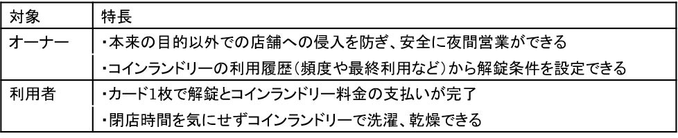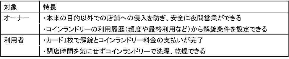 「AQUAランドリーカード」 はプリペイド式の非接触ICカードで、発行されたコインランドリー店舗でのみ利用可能です。本システムでは 「AQUAランドリーカード」 の利用履歴をもとに、店舗の出入り口(自動ドア)にて入退店の管理を行うことができます。これにより、日中は誰でもコインランドリーを利用できますが、夜間の営業時間では 「AQUAランドリーカード」 を照合して、既存顧客のみ入店可能とする運用が可能なため、無用な侵入を防ぎ、夜間も安心・安全なコインランドリーとして利用できるようになります。