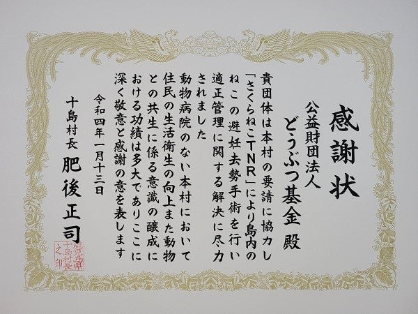 犬や猫の殺処分ゼロを目指して全国で活動する公益財団法人どうぶつ基金(兵庫県芦屋市)に、日本一長い村として知られる鹿児島県十島村から感謝状が贈呈されました。