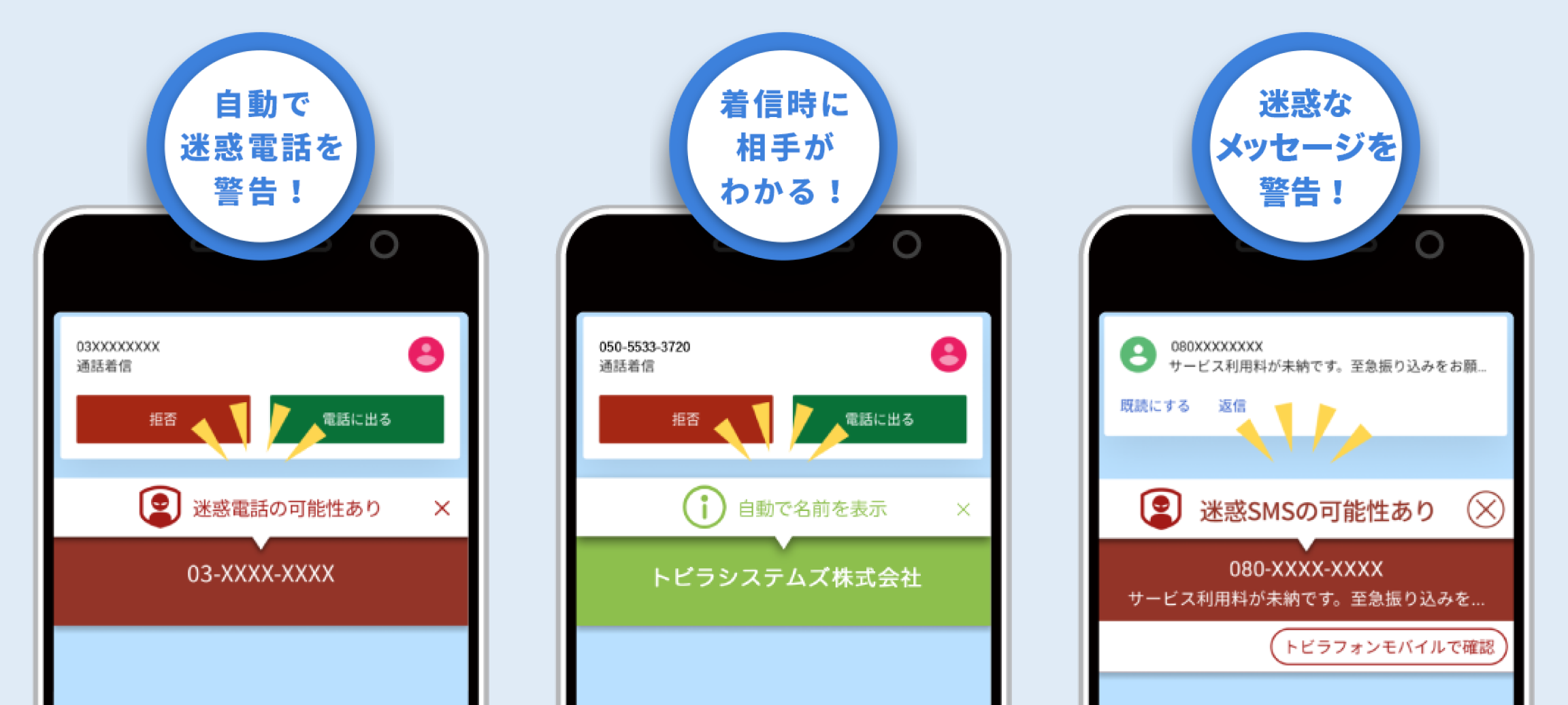 迷惑電話を自動で警告・拒否する各種モバイルアプリを提供しています。迷惑電話の着信時だけでなく、発信のダイヤル時にも危険をお知らせするため、詐欺被害防止につながります。電話帳に登録していない番号も、トビラシステムズのデータベースと合致する場合は発着信時に事業者名称を表示するので、安心して電話に出られます。
