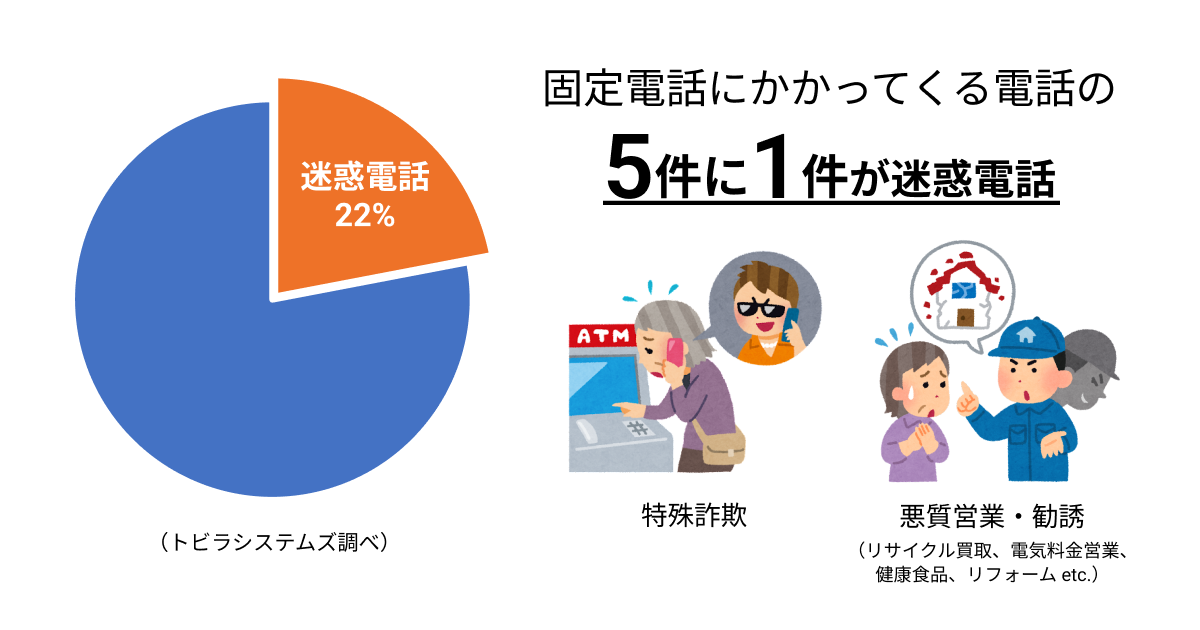 また、トビラシステムズの調査では、固定電話着信のおよそ5件に1件が特殊詐欺や悪質営業・勧誘などを含む迷惑電話であることがわかっています。固定電話を利用する高齢者、特に家族と離れて暮らす方は、固定電話をきっかけに特殊詐欺被害にあいやすい状況にあります。