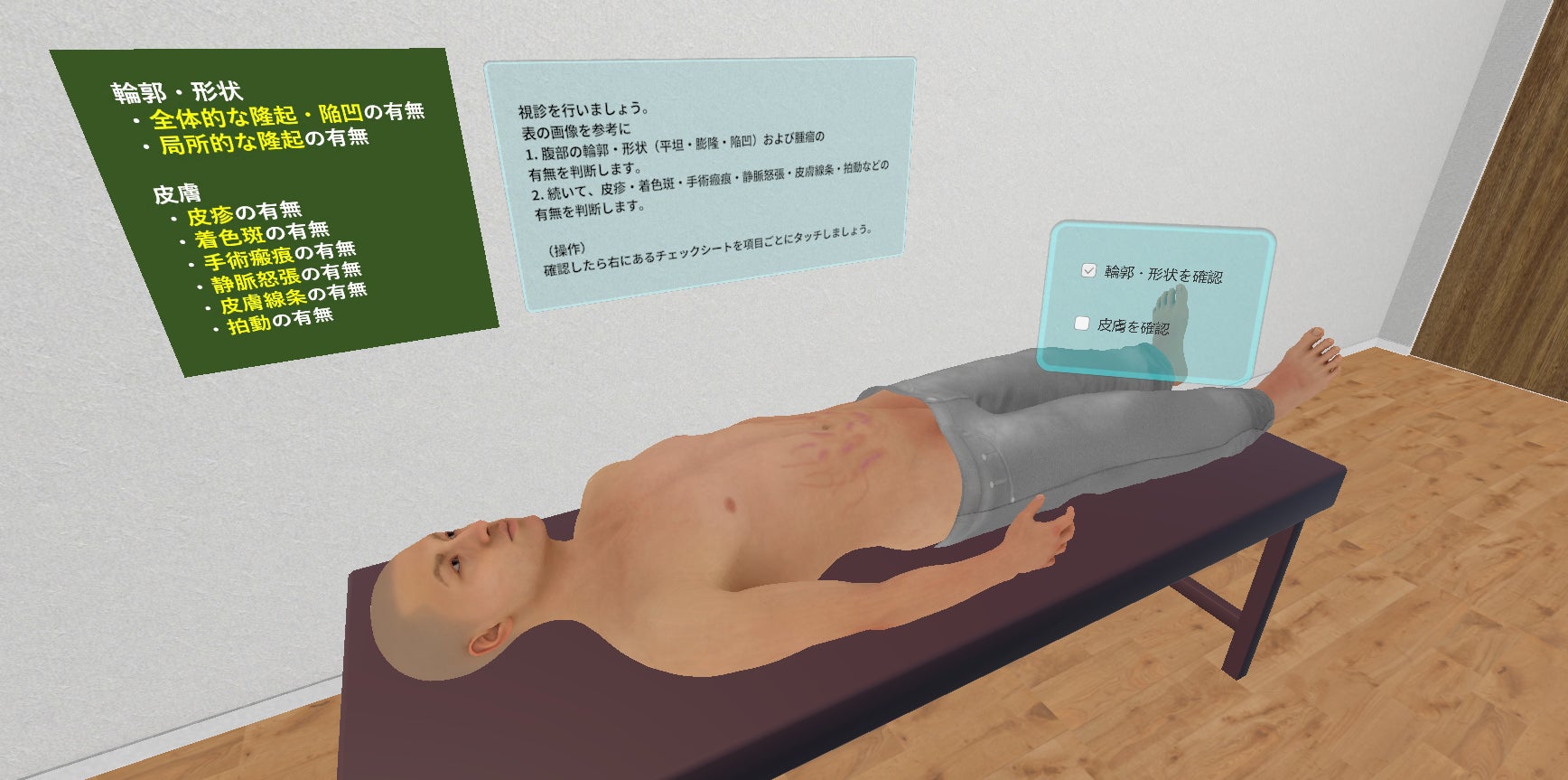 実際の医療現場における実習のように自分の身体を使って体験しながら学習できる仮想空間