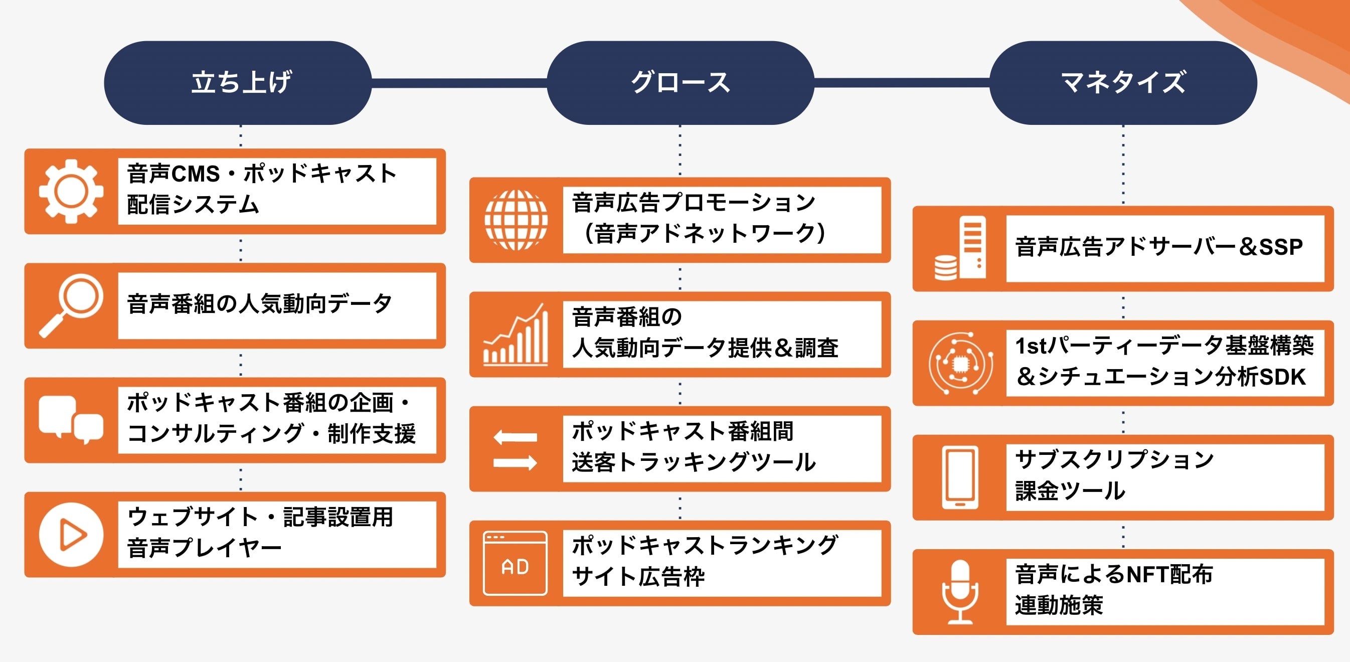 媒体社向けにポッドキャスト立ち上げ・運用ツールを提供。グロース・マネタイズを支援。音声CMS、アドサーバー、SSP提供、課金ソリューションを包括的にサポート