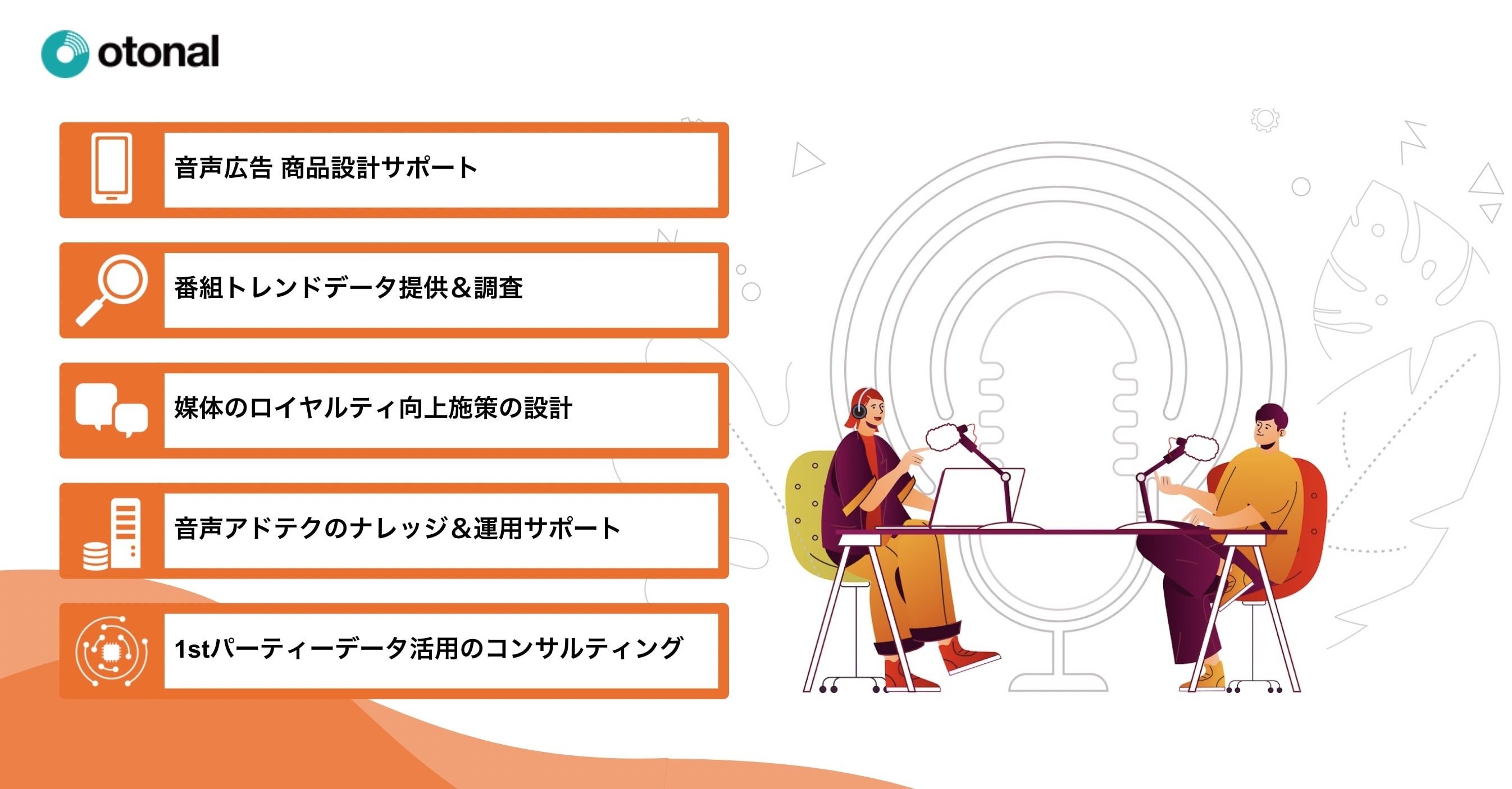オトナルは、デジタル音声広告と音声コンテンツに特化したマーティング&メディアカンパニーとして、音声ソリューションの開発・提供を通じ、国内における音声広告市場の発展をミッションとしています。