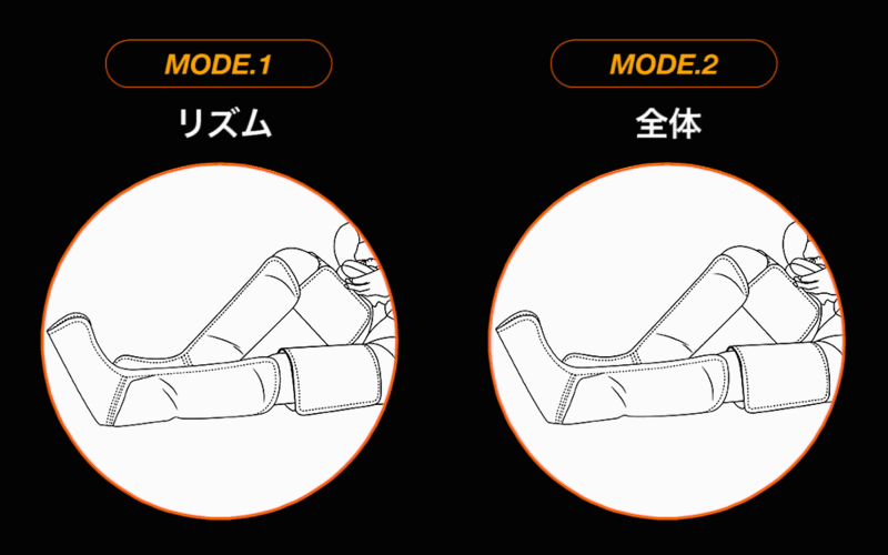 モード2は脚全体に同時に空気が入るので太もも、ふくらはぎ、足裏を同時に絞り上げることができます。