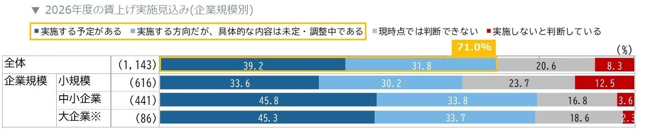 「賃上げを実施する予定がある」または「実施する方向だが具体的内容は未定」と回答した企業は全体の71.0%となり、約7割の企業が賃上げを行う方針であることが分かりました。一方で、約2割の企業は現時点で判断を保留しています。