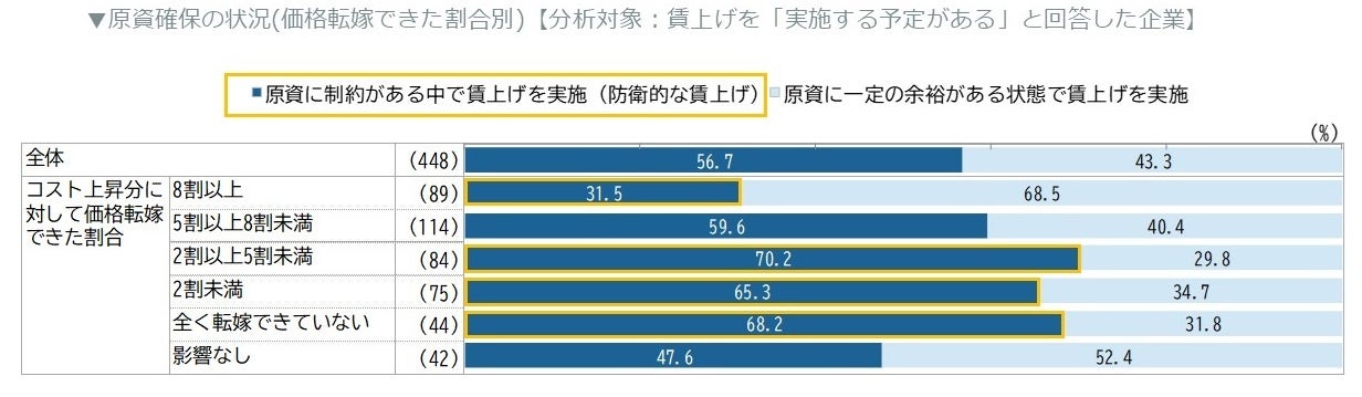 調査結果からは、コスト上昇分を十分に価格へ反映できている企業ほど、原資に余裕を持った状態で賃上げを実施できている傾向がみられました。反対に、コスト上昇分の反映が進まない企業では「防衛的な賃上げ」の割合が高くなっています。