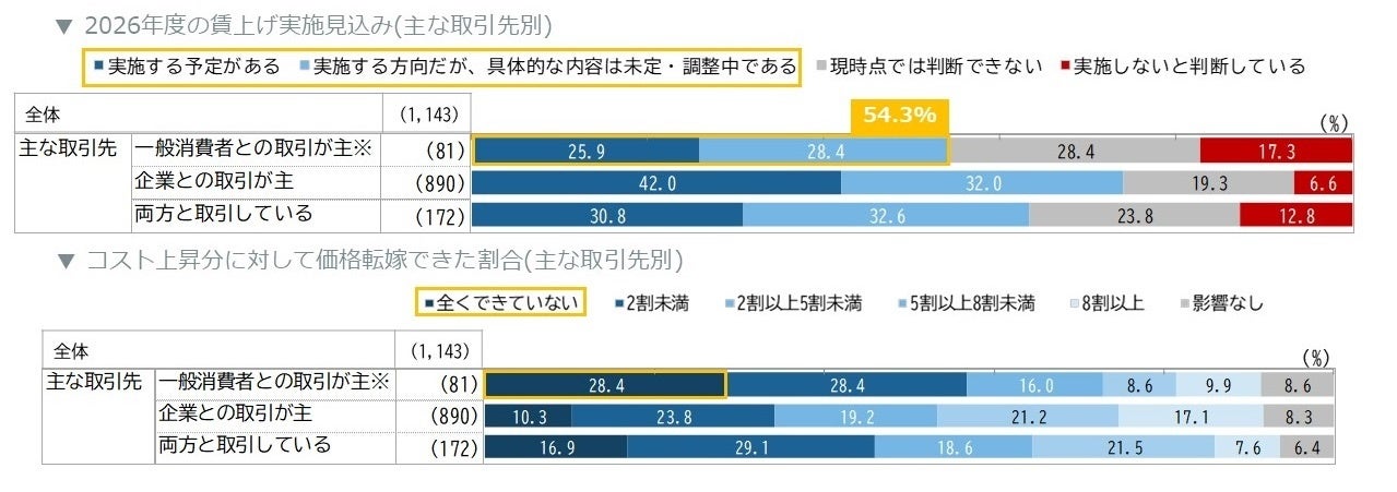 一方、主な取引先が一般消費者である企業では賃上げの実施見込みが54.3%とやや低く、