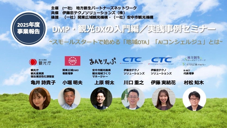 一般社団法人地方創生パートナーズネットワーク(代表理事:村松知木、東京都渋谷区、略称 R- NET)は、伊藤忠テクノソリューションズ株式会社(代表取締役社長:新宮 達史、本社:東京都港区、略称:CTC)との共催により、観光DX(デジタル・トランスフォーメーション)のスモールスタート事例を共有するセミナーを、2月25日(水)にオンライン開催します。