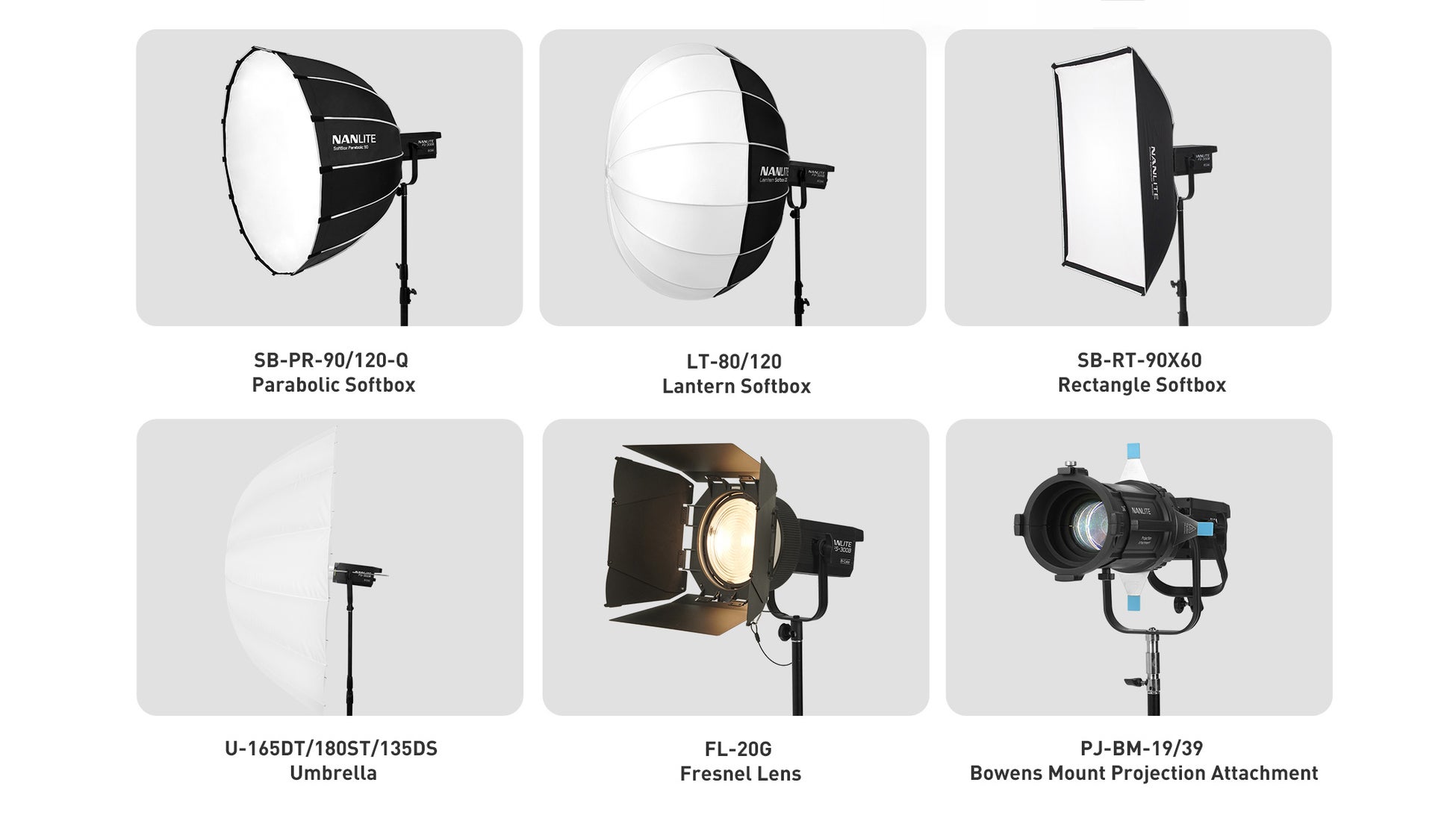 FS-300Bは汎用のボーエンズマウントになっているためNANLITE製のアクセサリーのほとんどを装着して使用することができます。光量が強いため、中型〜大型のソフトボックスを使用しても広い範囲を明るく照らすことができます。