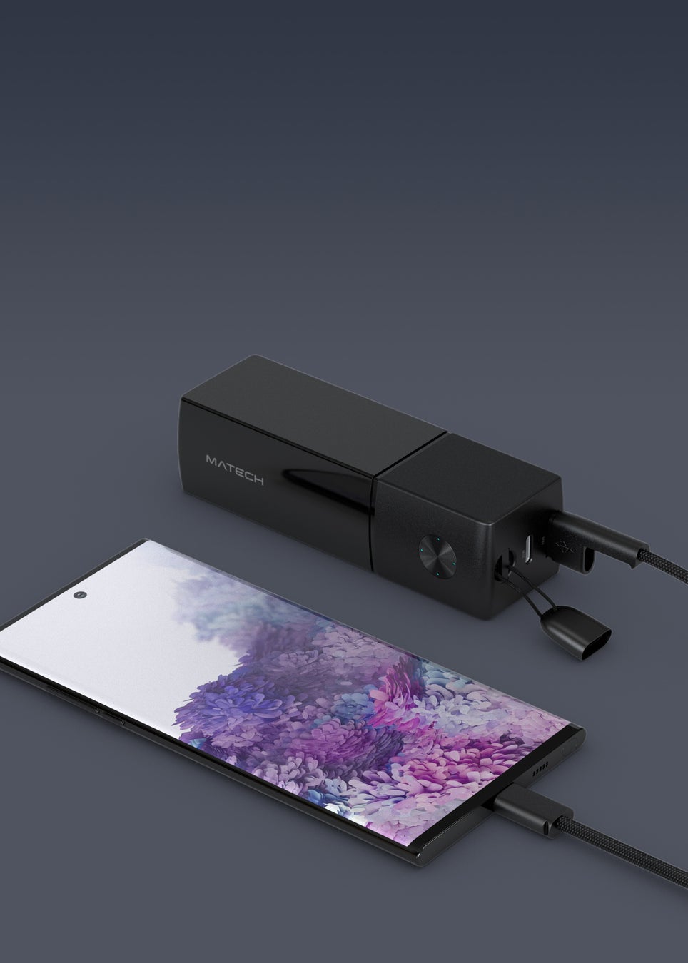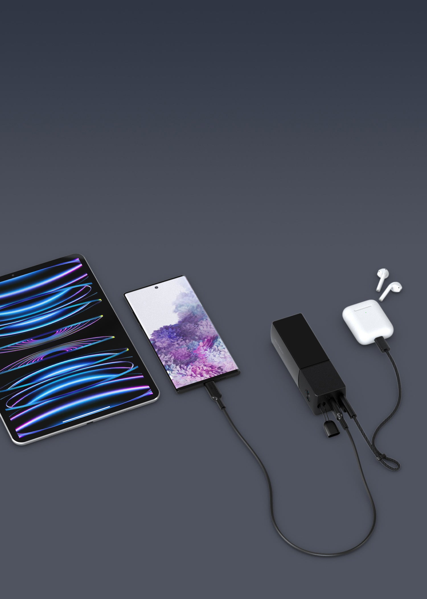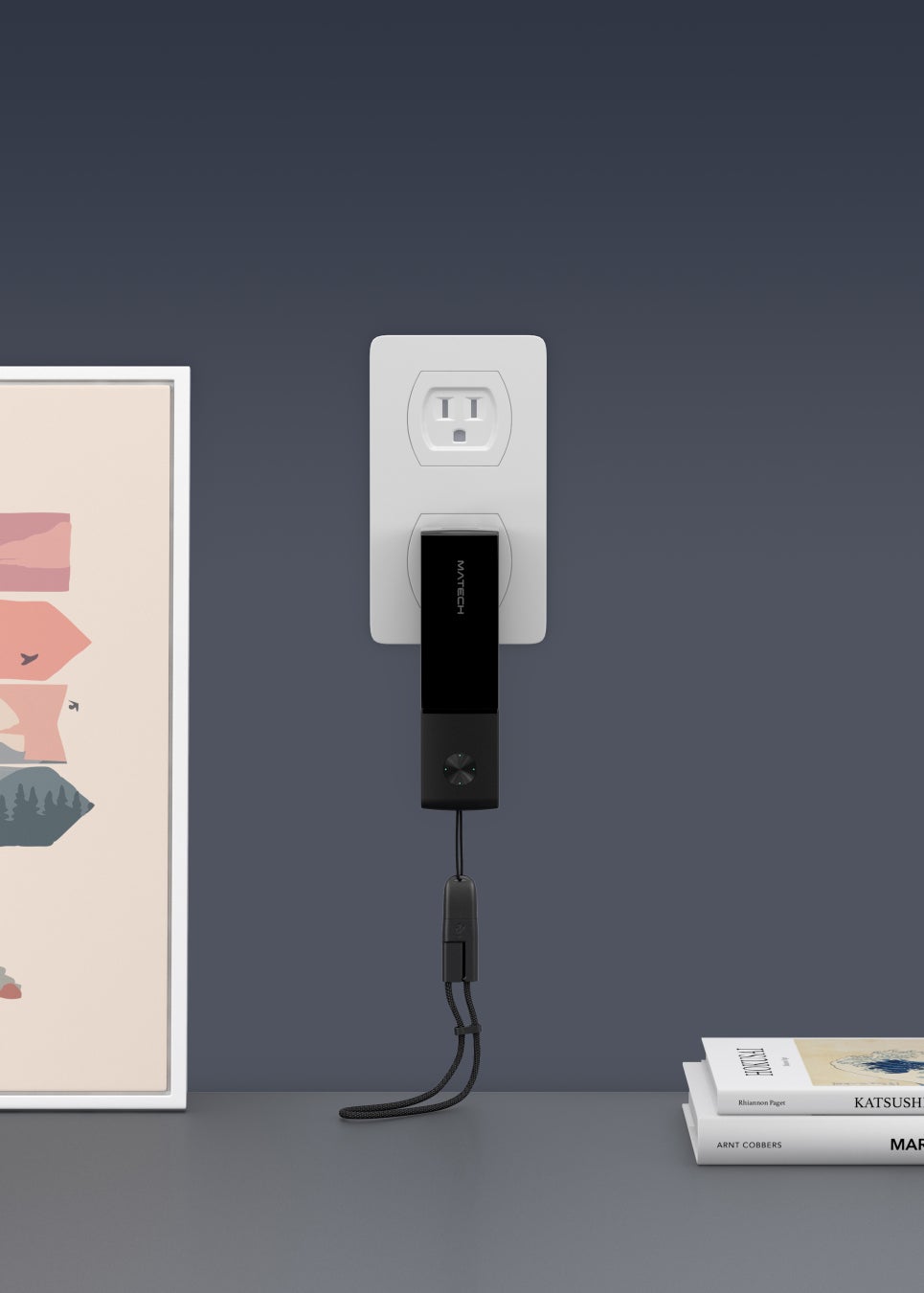 ケーブル付きストラップを採用することで、究極的なミニマルを目指しました。Type-Cケーブル、及びライトニングケーブルの脱着可能なストラップを採用し、別にケーブルを持たずにして、持ち運ぶことができます。