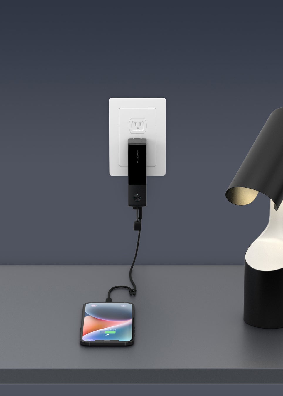 コンセント、バッテリー、ケーブルを集約した1台3役のリップスティック型で、ポーチやバッグにもすっぽり入る小型デザインです。折りたたみ式コンセントプラグを搭載しているので、モバイルバッテリーをコンセントに差し込むだけでかんたんに充電ができます。また、それぞれUSB-A、USB-Cを1ポートずつ搭載しているので、デバイスごとに異なるケーブル端子でも、PowerBar 5000 モバイルバッテリー1つで様々なデバイスを充電することができます。