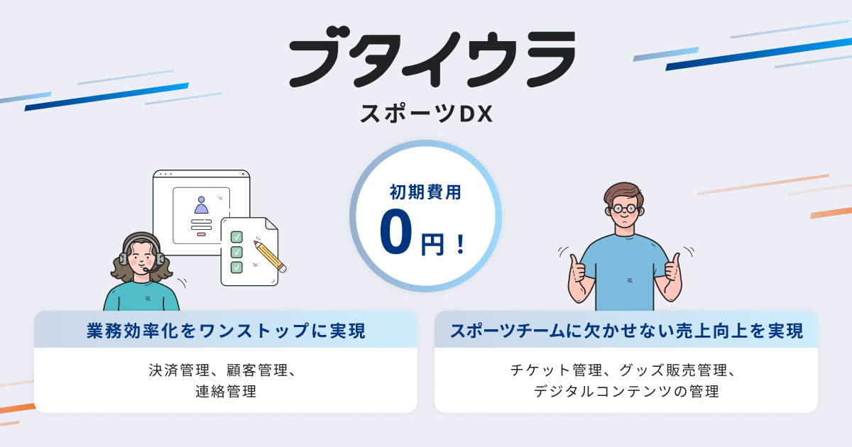 ブタイウラは、スポーツチームのDXの推進を支援します。ファンクラブの決済管理・顧客管理・連絡管理をワンストップに提供し、業務効率化を実現します。また、オプションとして、チケット管理・グッズ販売管理・デジタルコンテンツの管理といったスポーツチームに欠かせない売上向上を実現する機能も充実しております。