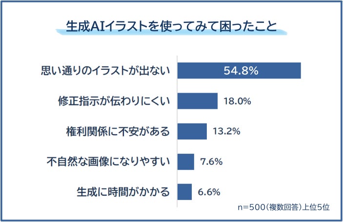「生成AIイラストを使ってみて困ったこと」の圧倒的1位は「思い通りのイラストが出ない(54.8%)」でした。2位「修正指示が伝わりにくい(18.0%)」、3位「権利関係に不安がある(13.2%)」と答えた人も多くなっています。