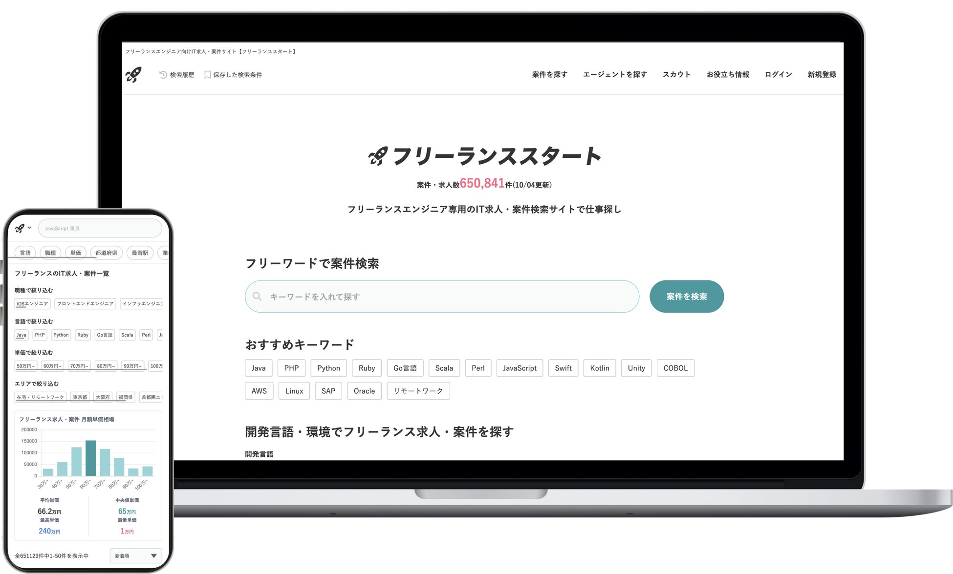 「フリーランススタート」は2018年より展開する日本最大級のフリーランスエンジニア専門の案件一括検索サイトです。