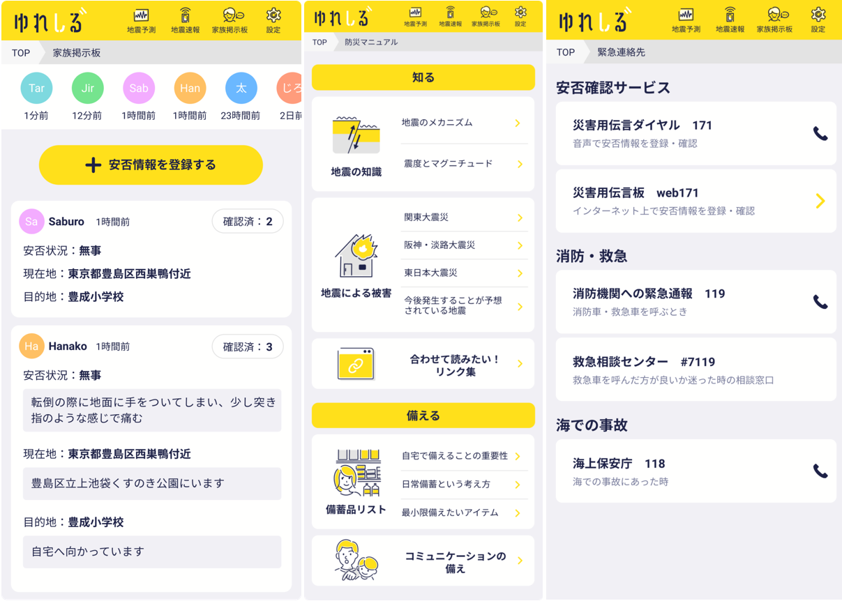 有事の際に利用できる緊急連絡先や避難所リスト、家族掲示板などの機能を搭載。地震予測が発令された場合に大切な人と一緒に事前に備えることができます。