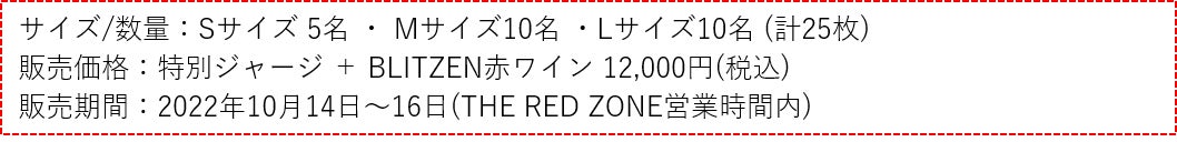 今回のジャパンカップ限定スペシャルジャージは、宇都宮ブリッツェンのポップアップストア『THE RED ZONE 2022』にて、限定販売(25名様限定)。更にUTSUNOMIYA BLITZENラベルの赤ワイン(フランス ボルドー産)720mlが1本セットの販売となります。