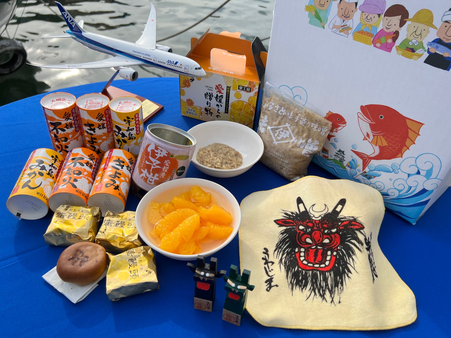 ⻨みそ(500g)、蜜饅頭(4 個入セット)、缶詰(甘夏、はっさく、伊予柑、ぽんかん)、柑橘ジュース 6 本セット(125ml)温州みかん、きよみ、不知⽕ 各 2 本、⽜⻤ミニハンカチ(200mm × 200mm)、⽴⽜⻤ ⼩×2 個(⾼さ 70mm × 幅 20mm)