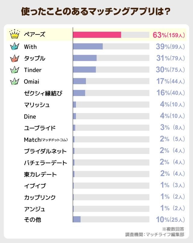 マッチングアプリ利用者253名にアンケート調査|人気のアプリや実際に出会えているのかなどの調査を実施【2024年最新】