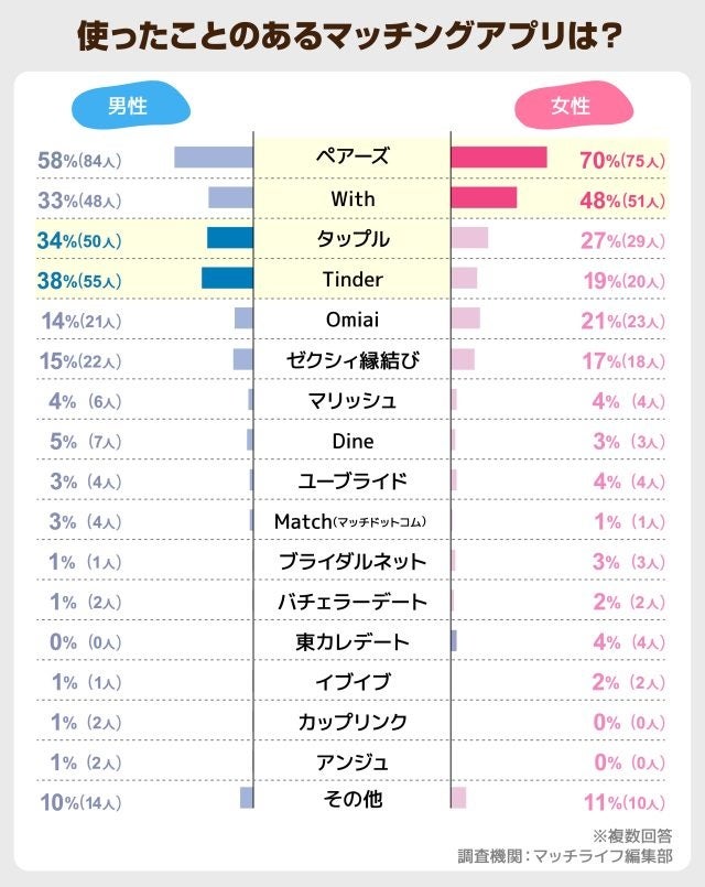 男性は素早い出会いに特化している「タップル」や「Tinder」の利用率が若干高い結果でした。