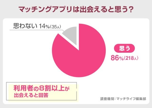 マッチングアプリ利用者の86%がアプリ内で出会えると思うと回答しています。恋人を見つけるまではいけなくても、大半の人が出会えると感じているようです。