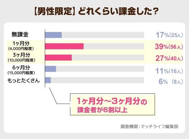 男性の課金額について調査したところ、1ヶ月分~3ヶ月分のプランを購入しているユーザーが6割以上と多いことが判明しました。