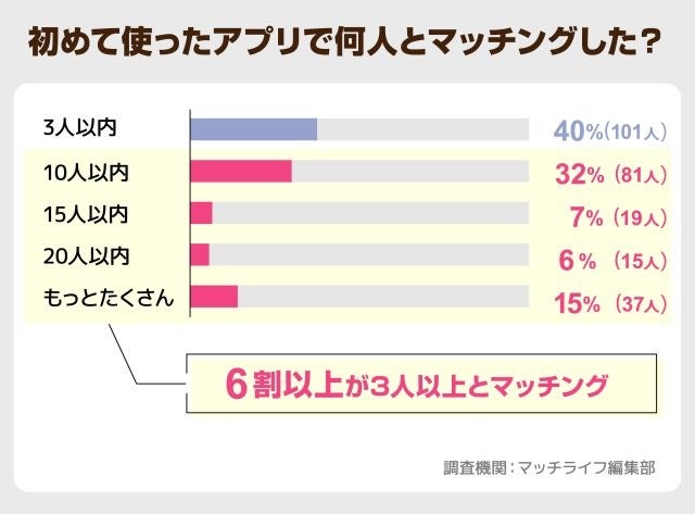 初めて使ったアプリでマッチングした人数についてのアンケートを取ったところ、アプリ初心者でも60%の人が3人以上とマッチングできることがわかりました。