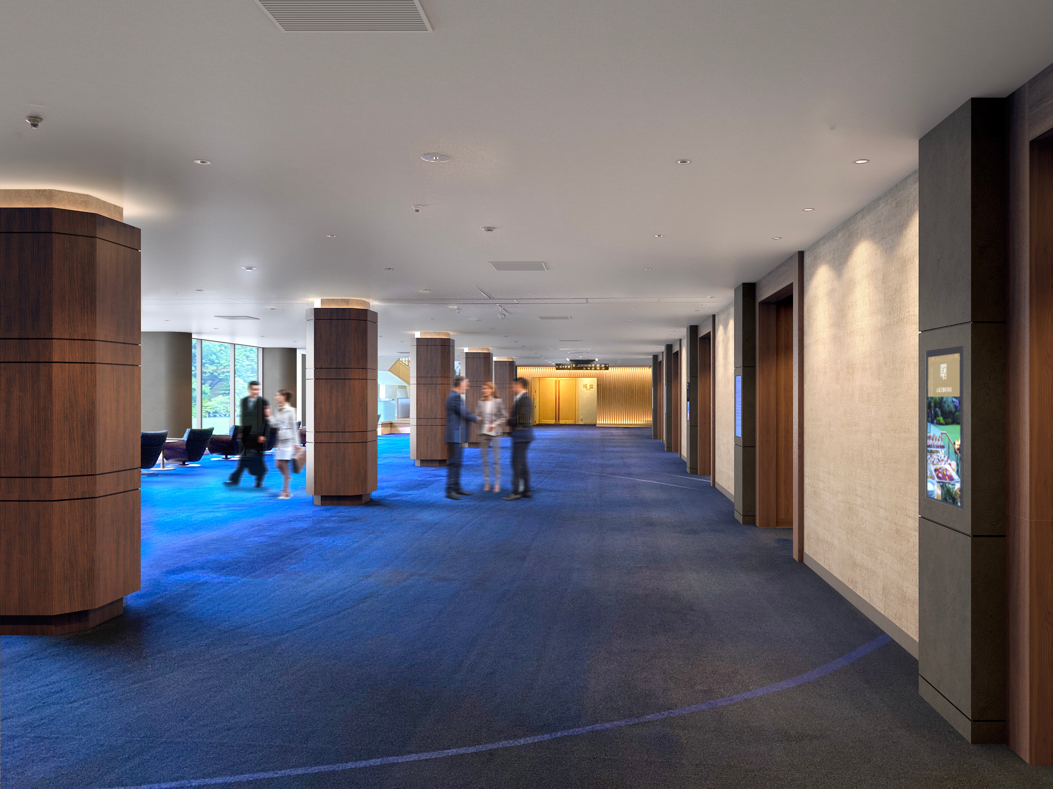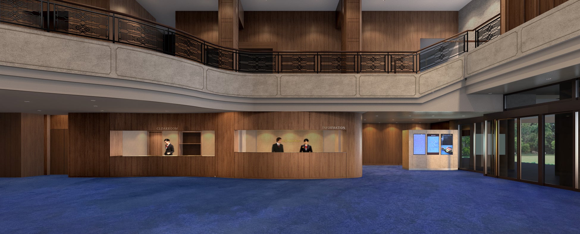 「INFORMATION」カウンターと「CLOAKROOM」は、最奥の壁面に至るまで、濃い木目で統一することで、お客様が正面入口から入られた際にそこはかとない拡がりを感じさせるデザインとしました。木目の温かな風合いを生かしつつ、訪れた方に落ち着きと安らぎをもたらすスペースといたします。