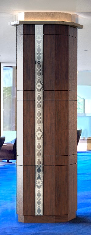 柱にあしらわれたエッチングミラーは、幾何学的な美術様式を採り入れた、アールデコを採用しました。加えて、幾何文様のデザインのイメージとなったのが「ブバルディア」、和名をカンチョウジ(管丁字)と言います。