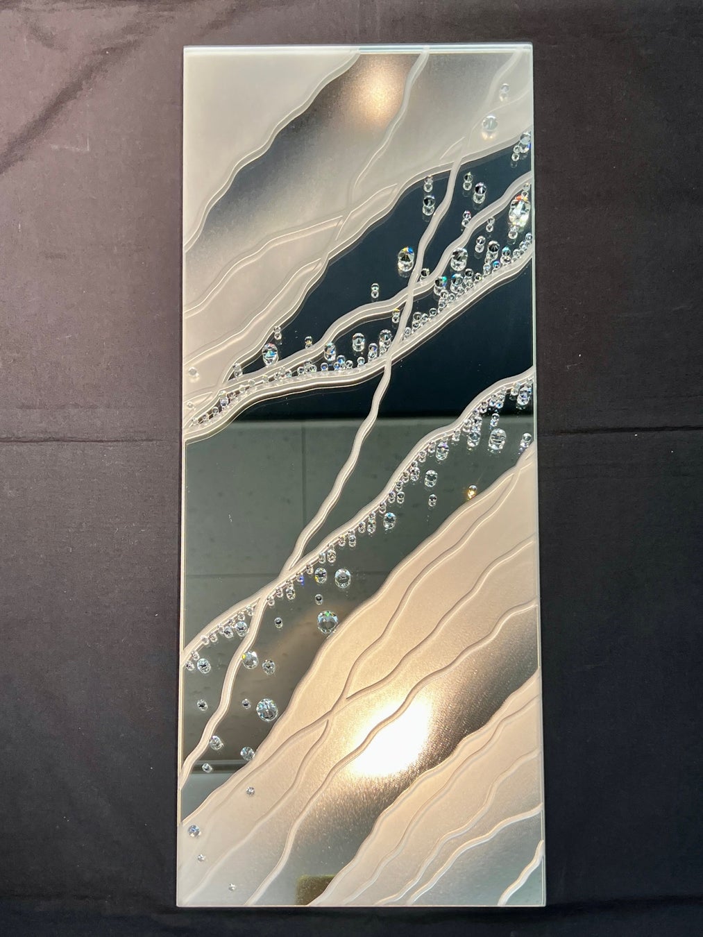 エッチングミラーとは、ガラスに圧縮した空気で砂を吹き付けて彫刻する技法です。