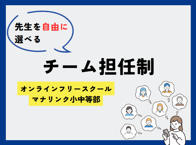 チーム担任制とは、通常は一人の担任教師が担当するクラスに対して、複数の教師がチームを組んで指導とサポートを行う制度です。多様な視点で指導評価をすることや、教師の負担分散を目的に教育機関で導入され始めました。マナリンク小中等部でも、児童生徒があらゆる大人と関わっていくことが必要であると考え、チーム担任制を導入をすることとなりました。教育機関と異なる点は、1人の生徒に対して複数の担任制であるという点と教師を選べる点となります。
