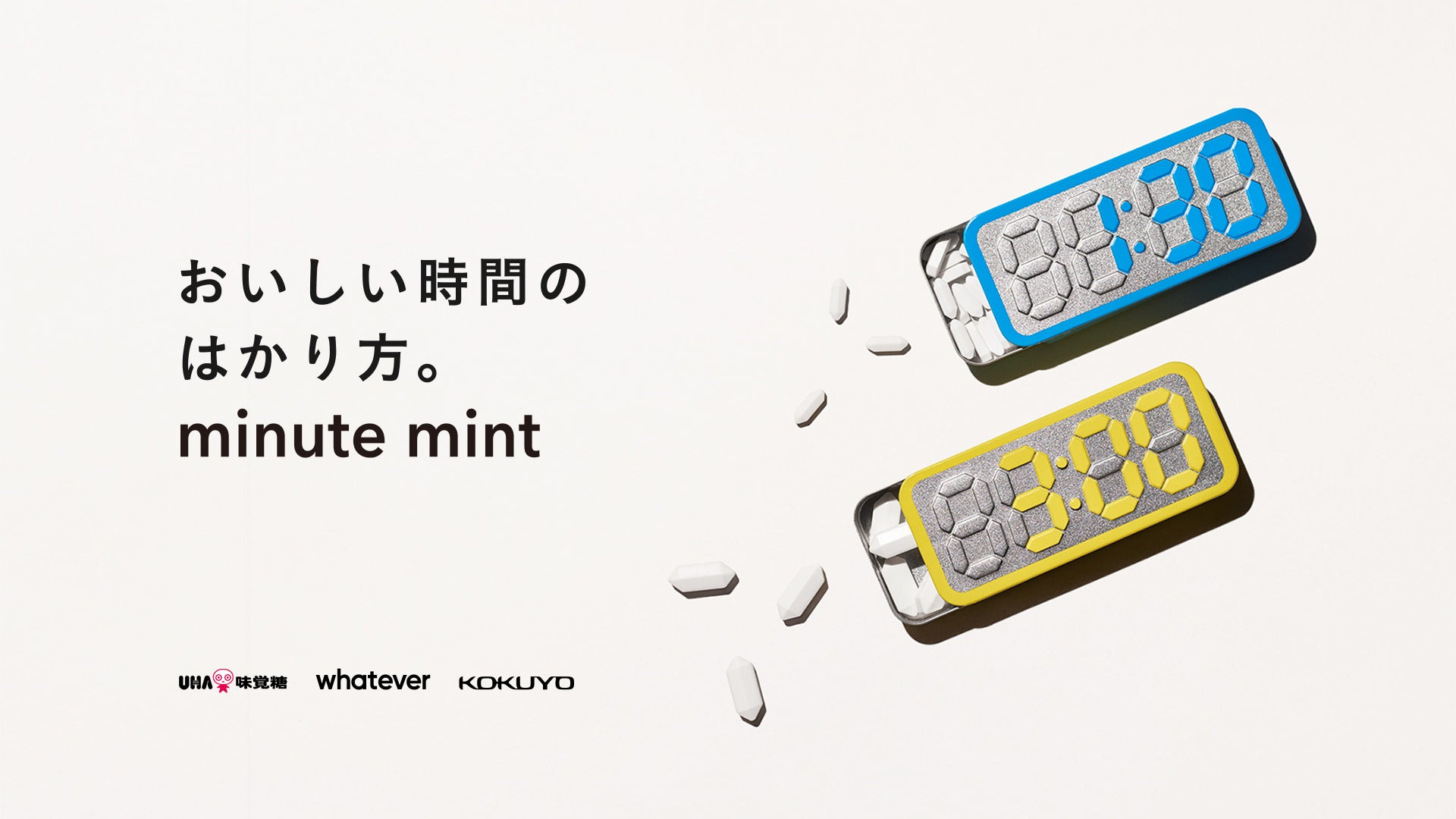 minute mint は、Whatever(クリエイティブ・スタジオ)、コクヨ(文具・オフィス家具メーカー)、UHA味覚糖(菓子メーカー)の3社が共同開発したミントタブレットです。Whatever がアイデアとブランディングを、コクヨがプロダクトデザインを手がけ、UHA味覚糖が製造と流通を担っています。