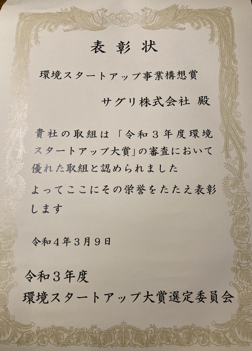 環境省穂坂環境大臣政務官及びサグリ株式会社代表取締役坪井俊輔の賞状授与式での記念撮影